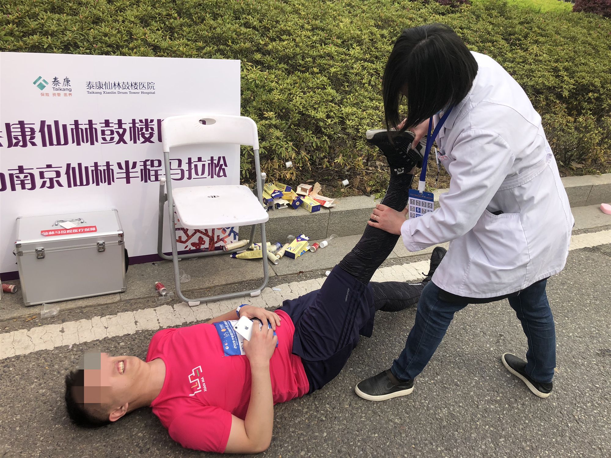 医护人员现场帮助赛中扭伤、肌肉拉伤、抽筋选手