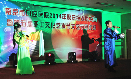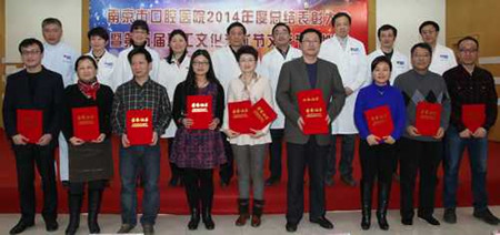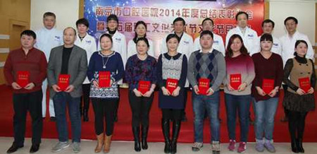 王磊书记宣读了《关于表彰2014年度医院先进集体和先进个人的决定》,对第二门诊部等5个“行风先进集体”、口腔修复科等5个“医院感染管理先进集体”、综合带教室教学组教学先进集体、口腔颌面外科等3个SCI论文发表先进集体,孙红等21名院先进个人、王新河等20名行风先进个人、杨卫东等26名医疗安全保障先进个人、王静等8名医院感染管理先进个人、泥艳红等7名SCI论文发表先进个人、唐恩溢等6名优秀教师、陈斌等3名对口支援工作先进个人、卢明星等4名青奥医疗保障工作先进个人、龚瑶等7名工会工作积极分子、孙希文等2名计划生育工作先进个人表示祝贺,院领导为获奖集体和个人代表颁奖。