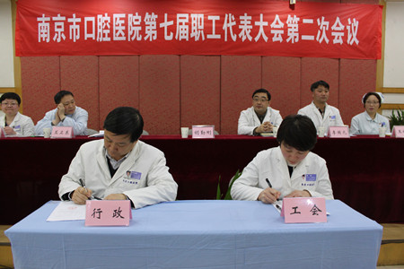 代表还听取了《财务预决算报告》、《审计工作报告》、《绩效分配报告》及《南京市口腔医院关于临床医生辞职的相关规定》、《南京市口腔医院关于首聘中、高级职称的相关规定》、《南京市口腔医院职工奖惩规定及实施细则》的修改意见。在随后的讨论中,各代表组对相关报告和修改文件进行了认真热烈地讨论,提出了许多科学合理的意见和建议。会议还对院领导班子进行了民主测评,医院行政与工会签订 “三双”集体协议、院党政领导与科主任分别签订《综合目标管理责任书》和《党风廉政建设责任书》。