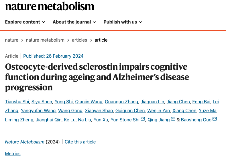 2024年2月26日,动漫色情片 郭保生、蒋青及石云团队在Nature Metabolism在线发表题为“Osteocyte-derived sclerostin impairs cognitive function during ageing and Alzheimer’s disease progression”的研究成果,该研究发现在衰老和AD进展过程中,骨细胞分泌的硬化蛋白(Sclerostin, SOST)可以穿过老年小鼠的血脑屏障结合于神经元的LRP6受体,导致Wnt/β-catenin通路功能障碍,通过LRP6/β-catenin/β-secretase(BACE1)信号传导增加Aβ蛋白产生,从而加重认知功能损伤。动漫色情片 郭保生副教授、蒋青教授和石云教授为本文通讯作者;动漫色情片 博士研究生石天舒、沈思虞和施勇为论文的共同第一作者。该研究获得国家自然科学基金重大项目、国家重点研发计划等项目支持。