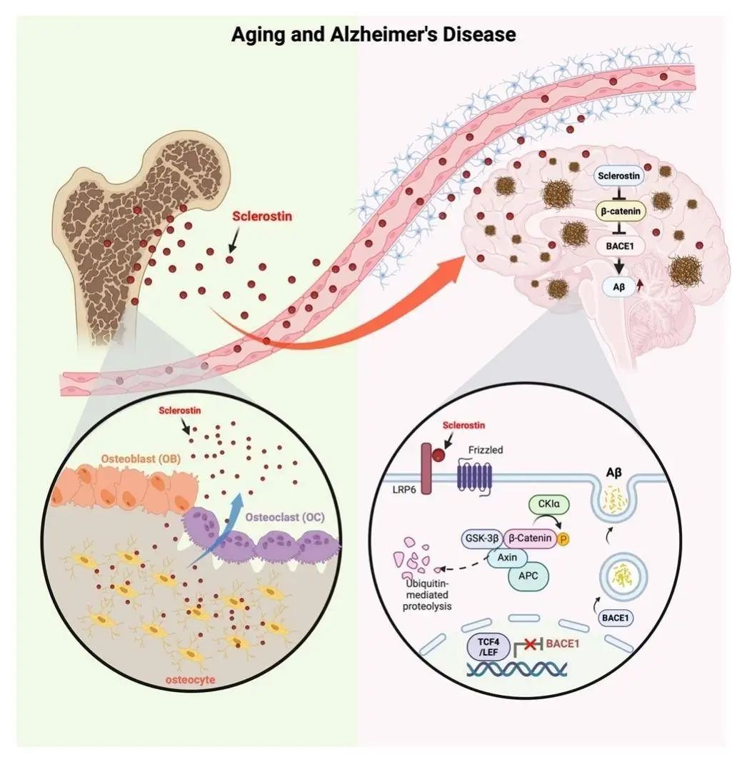 研究者构建了AD小鼠模型(APP/PS1小鼠),通过慢病毒在骨细胞中上调Sost表达,发现慢病毒注射2月后血清和脑组织中的Sclerostin水平均升高,皮质和海马中β-catenin水平降低、BACE1水平升高,并且脑组织中淀粉样蛋白沉积增多。同时,慢病毒过表达Sost后,APP/PS1小鼠认知功能显著降低。上述结果表明,骨细胞来源的Sclerostin可以通过促进AD小鼠模型中的Aβ产生加快AD疾病进展。