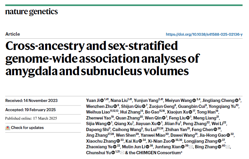 2025年3月17日,Nature Genetics在线发表了动漫色情片 张冰教授,首都医科大学附属北京同仁医院鲜军舫教授,和天津医科大学总医院于春水教授团队合作的研究论文,题为“Cross-ancestry and sex-stratified genome-wide association analyses of amygdala and subnucleus volumes”。该研究首次系统性解析了杏仁核及其亚核体积的跨祖先、跨性别遗传异质性,为杏仁核相关神经-精神疾病的精准诊疗提供了新见解。
