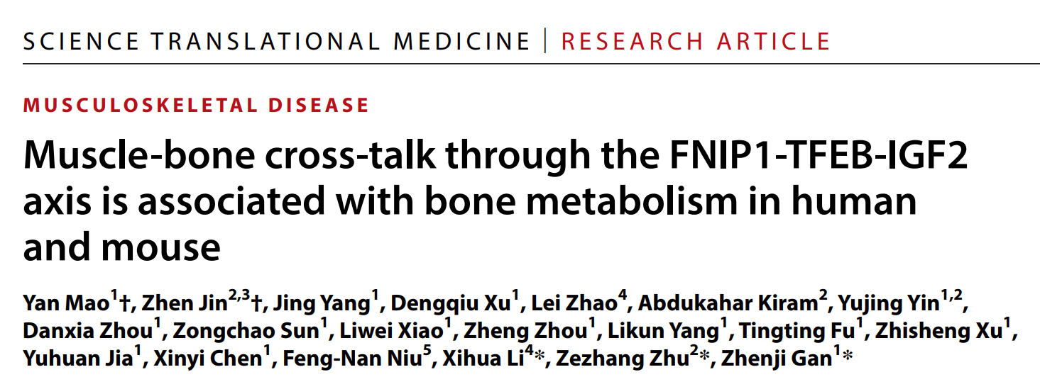 2024年6月5日,动漫色情片 甘振继教授课题组联合动漫色情片 附属鼓楼医院朱泽章教授课题组和复旦大学附属儿科医院李西华教授课题组在Science Translational Medicine长文发表了题为“ Muscle-bone cross-talk through the FNIP1-TFEB-IGF2 axis is associated with bone metabolism in human and mouse”的研究成果。此项工作发现了肌-骨对话轴调节肌源性骨病发病新机制,这一肌-骨信号轴可能成为治疗肌肉疾病和骨质疏松症的潜在靶点。动漫色情片 博士研究生毛岩,南京医科大学博士研究生靳祯为本文的共同第一作者。动漫色情片 甘振继教授,动漫色情片 附属鼓楼医院朱泽章教授和复旦大学附属儿科医院李西华教授为本文的共同通讯作者。该项研究得到了国家自然科学基金委、科技部、教育部、江苏省科技厅以及中央高校等基金的支持,并在相关研究方面得到合作实验室的大力协助与支持。