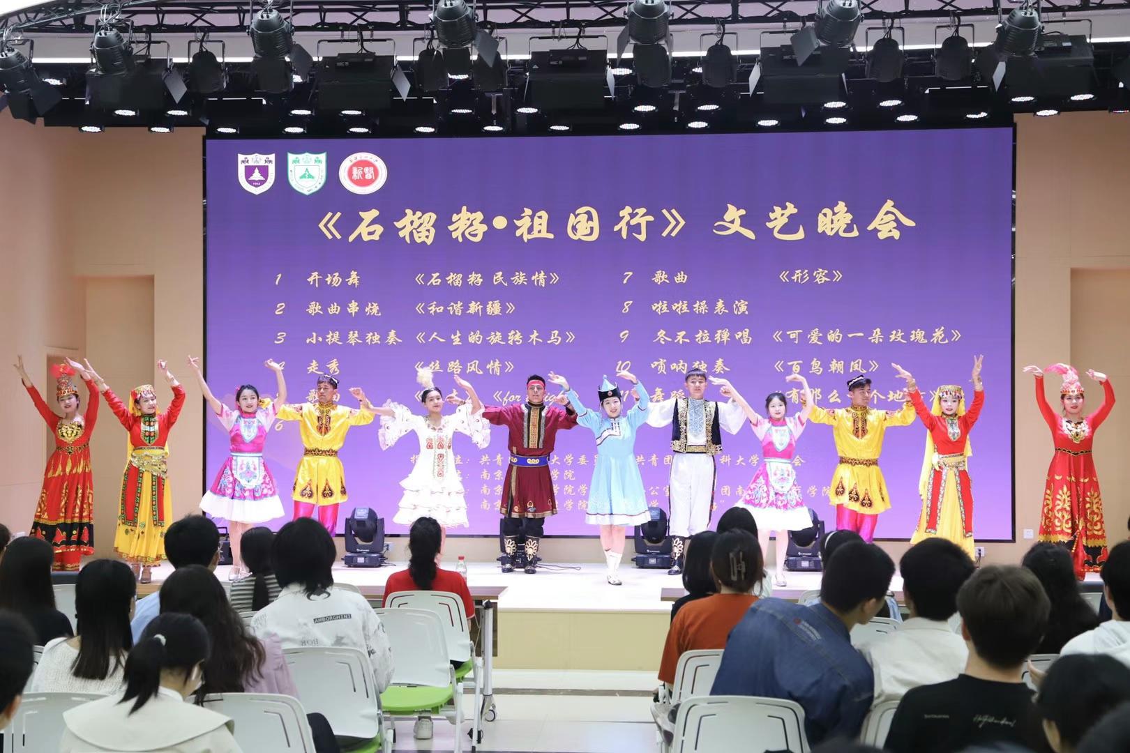 夜幕降临,“石榴籽•祖国行”文艺晚会在田家炳多功能厅拉开帷幕。从开场舞《石榴籽 民族情》到唢呐独奏《百鸟朝凤》,来自新疆医科大学和动漫色情片 的同学带来了异彩纷呈的表演。最后,参演人员和现场观众被新疆歌舞深深感染,共同上台舞蹈,为本次晚会画上了圆满的句号。