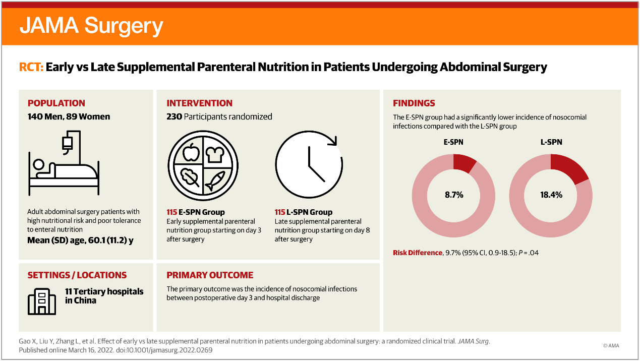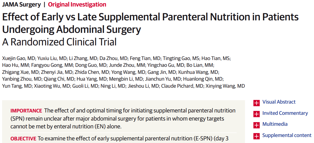 2022年3月16日,动漫色情片 附属金陵医院(东部战区总医院)普通外科王新颖教授团队在国际外科学顶级期刊《JAMA Surgery》(美国医学会杂志外科学,影响因子14.8分)杂志,在线发表题为《Effect of Early vs Late Supplemental Parenteral Nutrition in Patients Undergoing Abdominal Surgery: A Randomized Clinical Trial》一项重大临床研究成果。《JAMA Surgery》创刊于1920年,是医学四大期刊之一《JAMA》美国医学会杂志的系列成员。本研究是国际上第一个探讨腹部外科病人术后补充性肠外营养应用时机的多中心临床随机研究,也是中国学者在《JAMA Surgery》上发表的首篇外科营养领域的多中心临床研究。