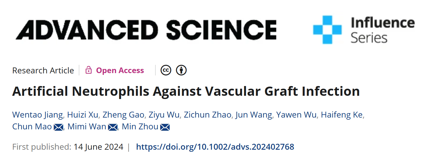 2024年6月14日,动漫色情片 周敏教授团队联合南京师范大学毛春教授课题组在Advanced Science在线发表题为“Artificial Neutrophils Against Vascular Graft Infection”的研究成果,该成果将趋化性成功引入AN标志着人工细胞在承担某些天然细胞功能方面迈出了重要的一步,为人工细胞未来广阔的应用前景提供了创新理念和技术支持。动漫色情片 附属鼓楼医院周敏教授、南京师范大学毛春教授和万密密副教授为本文的共同通讯作者;动漫色情片 博士研究生蒋文韬为论文第一作者,南京师范大学硕士研究生徐慧子为论文的共同第一作者。该项研究得到了国家自然科学基金、江苏省研究生科研与实践创新计划等项目的支持。