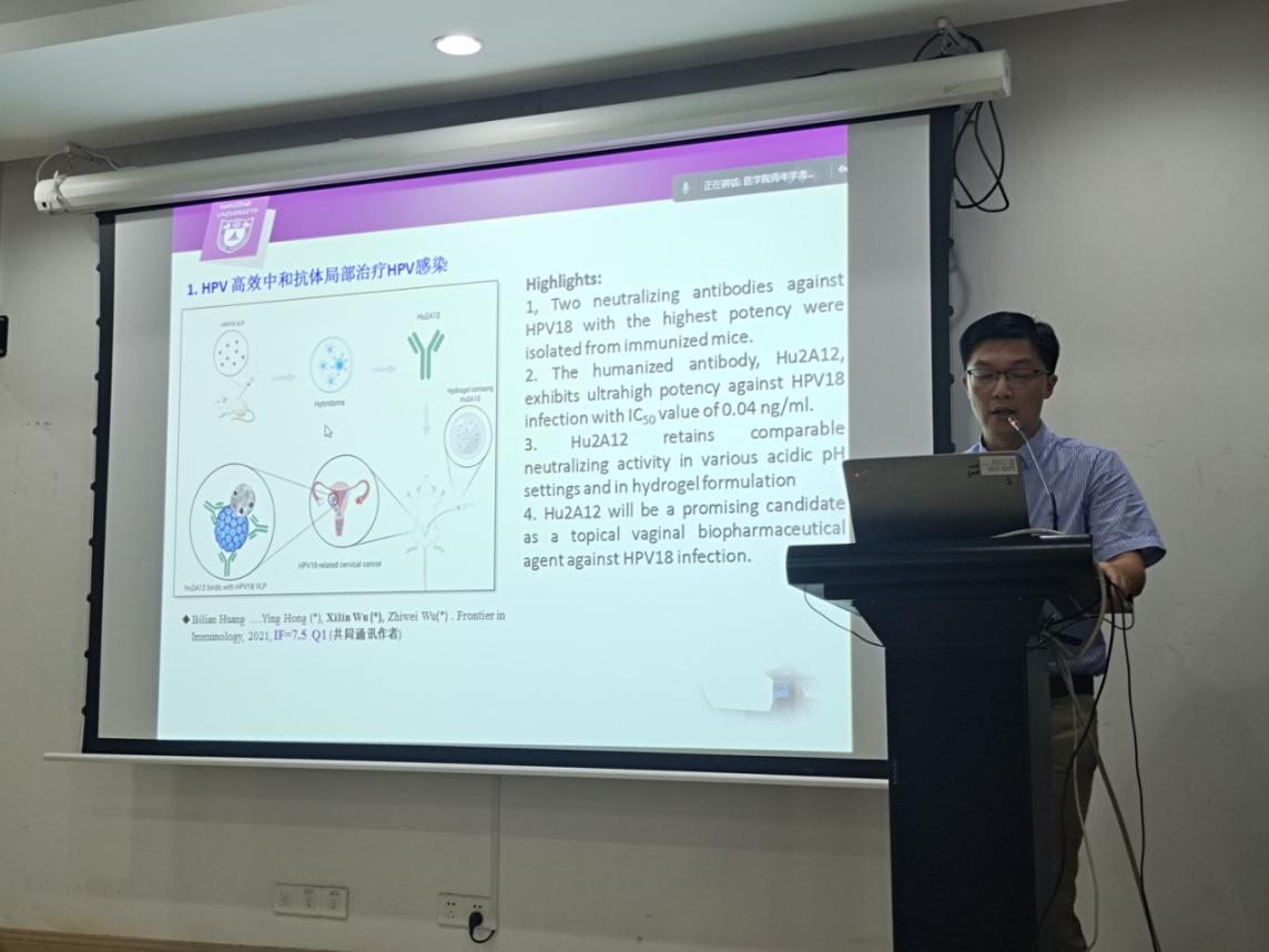 吴喜林老师围绕呼吸递送纳米抗体保护SARS-CoV-2感染hACE2小鼠这一主题向在场的师生进行内容分享与介绍,提出了治疗SARS-CoV-2的新手段。