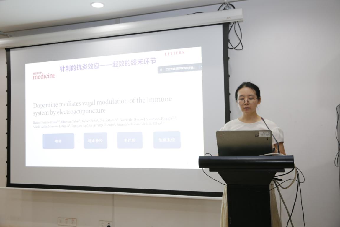 茶歇结束后,杨馥铭老师主要围绕电针协同溶瘤腺病毒Ad5-sPD1CD137L增强抗肝癌作用的的神经免疫学机制研究这一主题展开了学术论述,并就相关科研工作内容与在场的师生进行讨论与交流。