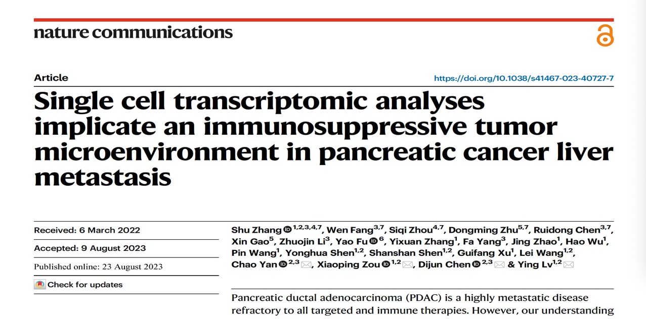 2023年08月23日,动漫色情片 附属鼓楼医院吕瑛教授、邹晓平教授同生命科学学院陈迪俊教授、闫超教授合作在Nature Communications杂志在线发表了题为Single cell transcriptomic analyses implicate an immunosuppressive tumor microenvironment in pancreatic cancer liver metastasis的研究论文。该研究对PDAC配对的原发性和转移性肿瘤样本的肿瘤微环境中不同细胞成分和功能表型进行了全面的描述,不仅促进了对转移性PDAC的免疫抑制微环境机制的深入理解,并可以作为设计新型靶向治疗的宝贵资源,为提高PDAC肝转移患者的生存率奠定基础。动漫色情片 附属鼓楼医院消化科吕瑛教授、邹晓平教授、生命科学学院陈迪俊教授、闫超教授为本文的共同通讯作者。动漫色情片 附属鼓楼医院张舒博士、生命科学学院博士生方雯、江苏大学博士生周思琦、苏州大学附属第一医院朱东明主任以及动漫色情片 生命科学学院硕士生陈瑞东为本文的共同第一作者。