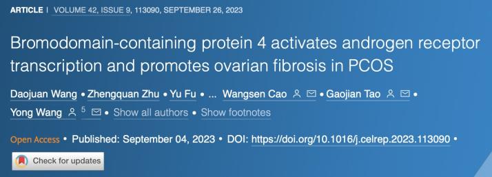 2023年9月4日,动漫色情片 王勇教授、曹望森教授团队在Cell Reports杂志发表了题为“Bromodomain-containing protein 4 activates androgen receptor transcription and promotes ovarian fibrosis in PCOS”的论文,该研究揭示了乙酰化“阅读”蛋白BRD4促进AR转录活化是PCOS卵巢纤维化的重要表观遗传学旁路。动漫色情片 王勇教授、曹望森教授和附属鼓楼医院陶高见主任为本论文的共同通讯作者,动漫色情片 博士研究生王道娟为本论文的第一作者。本研究得到了国家自然科学基金(#82201795,81971346)的资助。王道娟博士为本研究的第一作者。