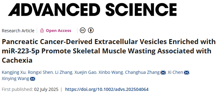2025年7月2日,动漫色情片 附属金陵医院王新颖教授团队、动漫色情片 生命科学院陈熹教授团队和中山大学附属第七医院张常华教授团队合作,在《Advanced Science》在线发表了题为“Pancreatic Cancer-Derived Extracellular Vesicles Enriched with miR-223-5p Promote Skeletal Muscle Wasting Associated with Cachexia”的研究成果。这项研究首次揭示胰腺肿瘤细胞通过释放细胞外囊泡实现与骨骼肌的远程通讯,驱动PDAC患者肌肉消耗;并发现循环EVs中的miR-223-5p是该过程的关键效应分子和潜在诊断标志物,为开发胰腺癌肌少症的精准诊断方法和靶向治疗策略奠定了坚实的理论基础。动漫色情片 博士研究生徐康菁为本文的第一作者。动漫色情片 附属金陵医院王新颖教授为本文的最后通讯作者。该项研究得到了国家自然科学基金委、科技部、江苏省科技厅以及中央高校等基金的支持,并在相关研究方面得到合作实验室的大力协助与支持。