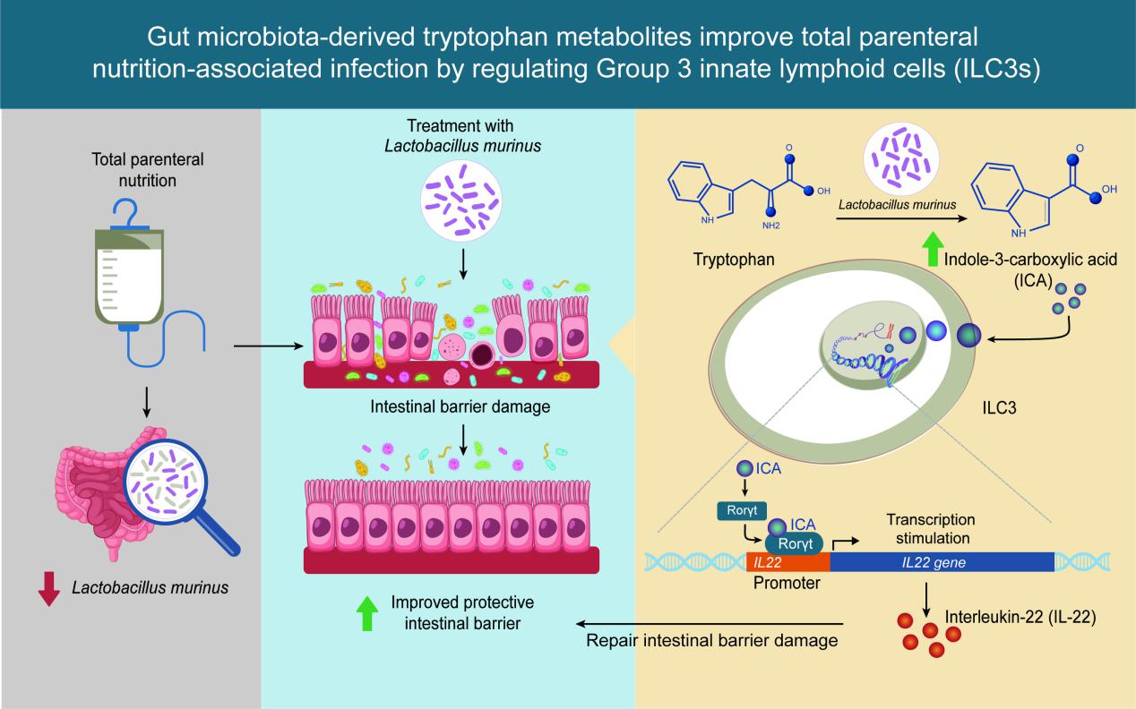 2025年2月26日,动漫色情片 附属金陵医院王新颖课题组在iMeta在线发表了题为“Gut microbiota-derived tryptophan metabolites improve total parenteral nutrition-associated infections by regulating Group 3 innate lymphoid cells”的研究成果。这项研究阐明了TPN过程中的“微生物-代谢-免疫”的调控机制,证明了靶向肠道微生物及肠道免疫稳态治疗IF、实现真正的“人工胃肠”是有希望的,为扭转“肠衰竭”不良结局和促进IF病人的肠康复治疗提供了重要的理论基础。动漫色情片 博士生黄龙昌、王鹏、刘帅和华中科技大学协和深圳医院邓桂芳为本文的共同第一作者。动漫色情片 附属金陵医院王新颖教授为本文的通讯作者。该项研究得到了国家自然科学基金委、科技部、江苏省科技厅以及中央高校等基金的支持,并在相关研究方面得到合作实验室的大力协助与支持。