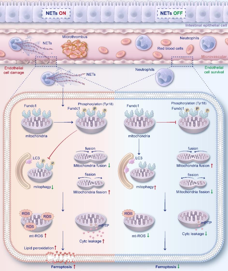 综上,该研究首次建立了II/R时NETs生成、内皮细胞线粒体功能障碍和铁死亡之间的联系。研究发现II/R时中性粒细胞在肠道微血管浸润、激活并产生NETs,过量NETs释放导致肠道微血管内皮细胞FUNDC1介导的线粒体质量控制失衡。内皮细胞线粒体功能障碍诱发活性氧积累和脂质过氧化,最终导致内皮细胞铁死亡增加,引发肠血管屏障损伤。通过早期干预中性粒细胞浸润和NETs生成为预防和治疗II/R发生后肠道微循环障碍提供了新的理论基础和治疗见解。