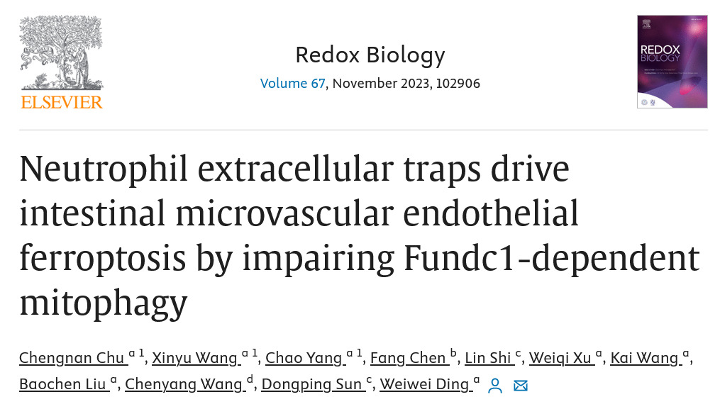 2023年10月4日,动漫色情片 附属金陵医院丁威威教授团队在氧化应激领域权威期刊Redox biology杂志在线发表了题为“Neutrophil extracellular traps drive intestinal microvascular endothelial ferroptosis by impairing Fundc1-dependent mitophagy”的论文,该研究揭示了II/R发生时NETs介导的微循环障碍的具体信号机制。动漫色情片 附属金陵医院丁威威教授为本论文的通讯作者,动漫色情片 博士研究生储诚南、王新宇、动漫色情片 附属金陵医院杨超医师为本论文的共同第一作者。本研究得到了国家自然科学基金(#82270587,81770532)的资助。