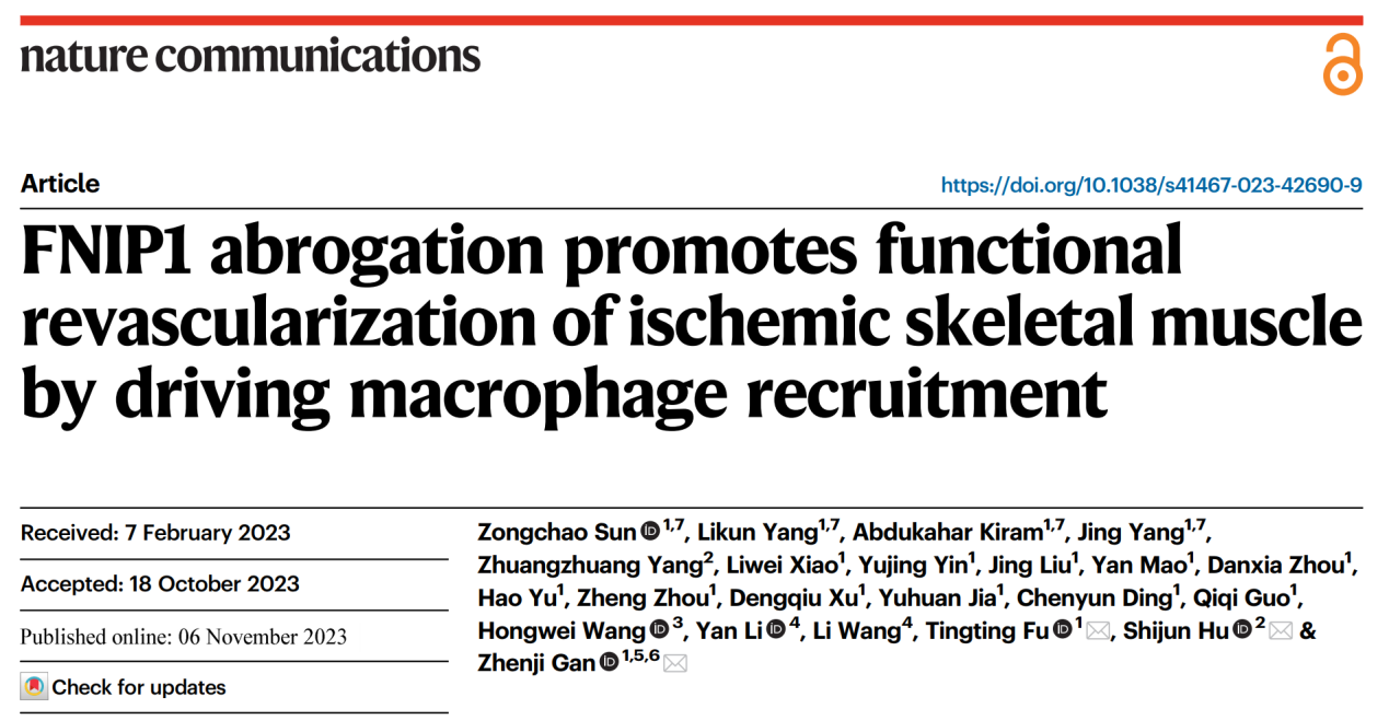 2023年11月6日,动漫色情片 甘振继教授课题组联合苏州大学胡士军教授课题组在Nature Communications长文发表了题为“FNIP1 abrogation promotes functional revascularization of ischemic skeletal muscle by driving macrophage recruitment”的研究成果。动漫色情片 博士研究生孙宗超、杨立坤、阿布都哈卡尔·克拉木、杨静为本文的共同第一作者。动漫色情片 甘振继教授、苏州大学胡士军教授及动漫色情片 付婷婷副研究员为本文的共同通讯作者。共同作者里还有动漫色情片 的王宏伟教授,江南大学的李言教授和王立教授等。研究得到合作实验室的大力协助与支持。上述研究得到了中国科学技术部、国家自然科学基金委、教育部、江苏省科技厅以及中央高校等基金的支持。
