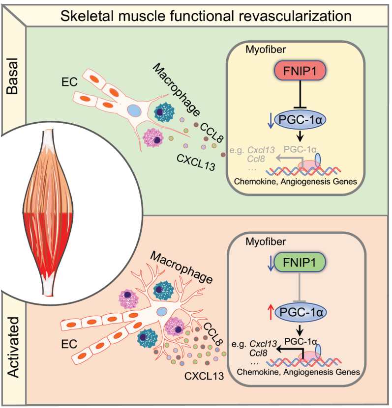 研究人员通过此项工作发现了骨骼肌血管稳态与功能性血管再生调控新机制:肌纤维FNIP1调控骨骼肌巨噬细胞招募,在肌肉缺血引起的功能性血管再生中至关重要。该研究为骨骼肌缺血性疾病的潜在治疗策略提供了新的理论线索。该研究发现了肌纤维FNIP1蛋白通过巨噬细胞招募调控骨骼肌血管稳态与功能性血管再生的新机制(图2);揭示了肌纤维与巨噬细胞间互作在骨骼肌功能性血管再生中的重要作用;拓展了代谢调控新的关键节点分子FNIP1新功能—骨骼肌血管网络内在“刹车机制”;为通过解除骨骼肌功能性血管再生的限制性因素,治疗肌肉缺血性疾病提供了理论基础。