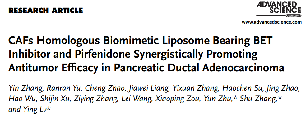 2023年11月16日,动漫色情片 附属鼓楼医院吕瑛教授、张舒博士和朱运药师在Advanced Science在线发表题为CAFs Homologous Biomimetic Liposome Bearing BET Inhibitor and Pirfenidone Synergistically Promoting Antitumor Efficacy in Pancreatic Ductal Adenocarcinoma的研究论文,该研究对胰腺癌肿瘤微环境中CAFs的功能表型进行了全面的描述,设计新型靶向材料针对CAFs,为胰腺癌的治疗提供新的理论基础和治疗见解。动漫色情片 附属鼓楼医院吕瑛教授、张舒博士,朱运博士为本文的共同通讯作者。动漫色情片 硕士研究生张尹、动漫色情片 生命科学学院博士研究生于冉冉、动漫色情片 附属鼓楼医院赵成博士为本文的共同第一作者。