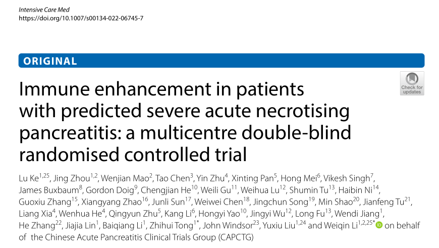 上述研究成果“Immune enhancement in patients with predicted severe acute necrotising pancreatitis: a multicentre double-blind randomised controlled trial”于2022年6月17日发表于重症TOP期刊《Intensive Care Medicine》,动漫色情片 附属金陵医院为论文的唯一通讯单位,柯路副教授、周晶博士、毛文健博士研究生为共同第一作者,童智慧副教授、李维勤教授为共同通讯作者。
