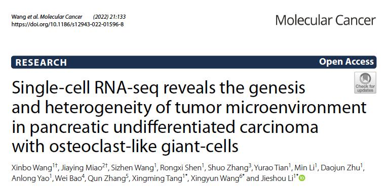 上述研究成果“Single-cell RNA-seq reveals the genesis and heterogeneity of tumor microenvironment in pancreatic undifferentiated carcinoma with osteoclast-like giant-cells”已于2022年6月23日在线发表于国际肿瘤生物学领域顶尖期刊《Molecular Cancer》杂志上。论文的通讯作者为动漫色情片 附属金陵医院黎介寿院士、唐星明教授和上海交通大学王星云教授,第一作者为王新波教授,数名院内胆胰肿瘤多学科综合诊疗协作组成员是重要参与者,研究工作得到了任建安教授、朱维铭教授的大力支持以及国家重点临床专科-普通外科建设项目、江苏省临床医学中心创新平台等项目的经费资助。