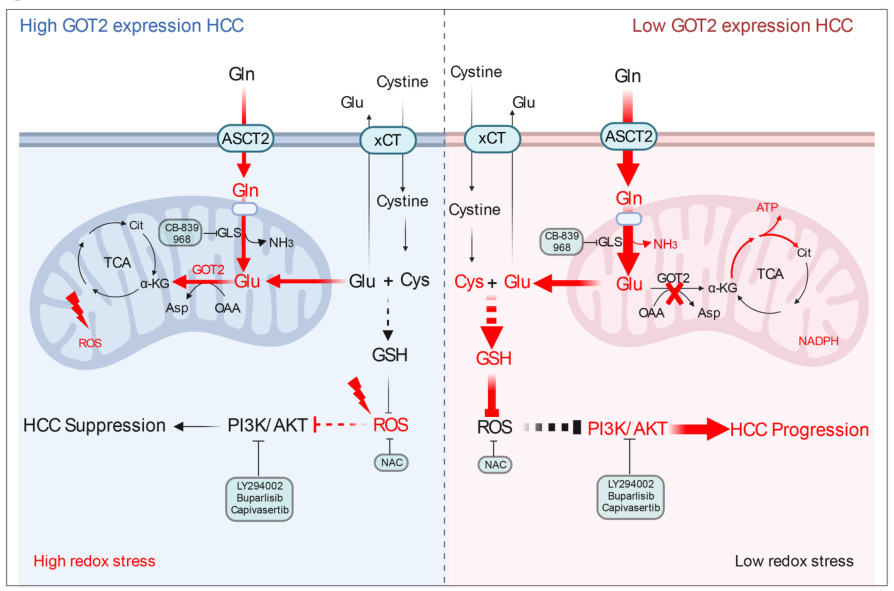 谷氨酸草酰乙酸转氨酶2(GOT2)参与谷氨酰胺代谢,介导谷氨酸和草酰乙酸转化为α-酮戊二酸和天冬氨酸。GOT2在正常肝脏组织中特异性高表达,但是随着HCC的恶性进展,GOT2的表达逐渐下调。动漫色情片 附属鼓楼医院余德才教授课题组在多个公共数据库及临床样本中明确,GOT2在HCC肿瘤组织中下调,并且与患者不良预后相关。体内外实验证实,GOT2 knockdown 促进了HCC细胞的增殖迁移、肝内及血行转移。通过13C5,15N2-谷氨酰胺同位素代谢流等实验发现,HCC中GOT2的降低,介导了谷氨酰胺代谢重编程,转向合成还原性谷胱甘肽(GSH),通过抵抗HCC进展中活性氧(ROS)损伤,维持肿瘤细胞氧化还原稳态,激活PI3K/AKT/mTOR信号通路从而促进了HCC的恶性进展。与此同时,GOT2沉默增强了HCC谷氨酰胺依赖及谷氨酰胺酶抑制剂(CB-839)的敏感性,通过体内外实验及LIMOR数据库证实GOT2沉默促进了HCC的CB-839治疗反应性。因此,GOT2有望成为HCC诊断和治疗的新靶点。