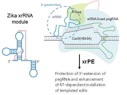 The prime editors (PEs) have shown great promise for precise genome modification. However, their suboptimal efficiencies present a significant technical challenge. By appending a viral exoribonuclease-resistant RNA motif (xrRNA) to the 3-extended portion of pegRNAs for their increased resistance against degradation, Zhang et al. develop an upgraded PE platform (xrPE) with substantially enhanced editing efficiencies in multiple cell lines. A pan-target average enhancement of up to 3.1-, 4.5- and 2.5-fold in given cell types is observed for base conversions, small deletions, and small insertions, respectively. Additionally, xrPE exhibits comparable edit:indel ratios and similarly minimal off-target editing as the canonical PE3. Of note, parallel comparison of xrPE to the most recently developed epegRNA-based PE system shows their largely equivalent editing performances. This study establishes a highly adaptable platform of improved PE that shall have broad implications.