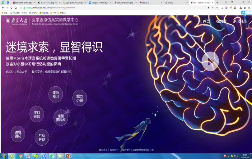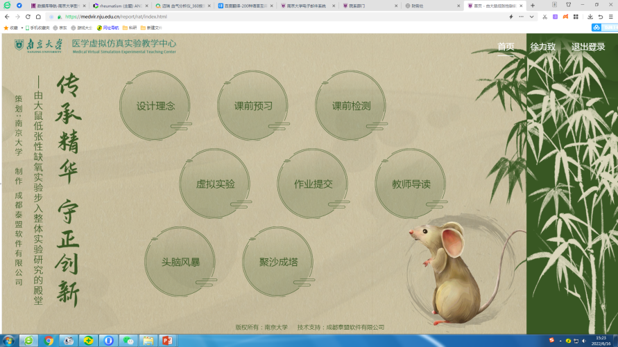 学院建设了medvir.sqpanime.com基础医学虚拟仿真实验平台网站。自主设计多个教学虚拟仿真实验项目以满足目前人才培养需求,鼓励教师和学生在教学活动中做时代的“破局者”,已部署《传承精华,守正创新——由大鼠低张性缺氧实验步入整体实验研究的殿堂》《世界上没有完全相同的两片树叶——由家兔急性坏死性肾病特案学习临床诊疗的预案设计》《迷境求索,显智得识——使用水迷宫系统检测长期微囊藻毒素-LR暴露对小鼠学习认知功能的影响》《知音辨位,显智得识——使用条件恐惧系统检测小鼠学习与记忆》等九个虚拟仿真实验项目。
